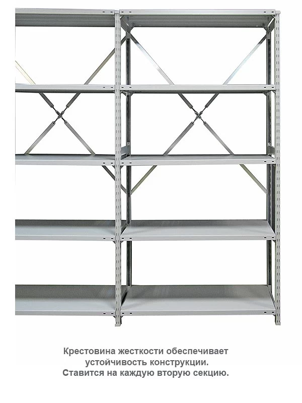 Металлические, усиленные полки стеллажа отличаются высокой надёжностью. Максимум распределённой нагрузки на одну полку – до 300 кг, на весь стеллаж – до 1800 кг.
